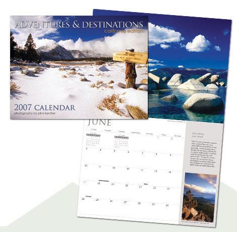 We're proud to announce the publication of our 5th annual calendar, available to the general public for the first time! Jaimi shares her experiences in this twelve month calendar, which includes 24 full color images featuring some of California's most beautiful destinations and adventure locations. This 9" x 12" calendar is carefully printed using the finest materials and is available in limited quanities. sale $5.95